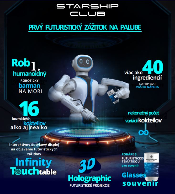 Ženeva, Švajčiarsko - 11. februára 2021 - Spoločnosť MSC Cruises dnes odhalila podrobnosti o pohlcujúcom, futuristickom klube hviezdnych lodí MSC spolu s robotom Robom, prvým humanoidným, robotickým, barmanom na mori. Rob bude obsluhovať v klube MSC Starship Club - aktuálne na palube najnovšej vlajkovej lode MSC Virtuosa, ktorá sa bude plaviť po moriach od 16. apríla tohto roku.