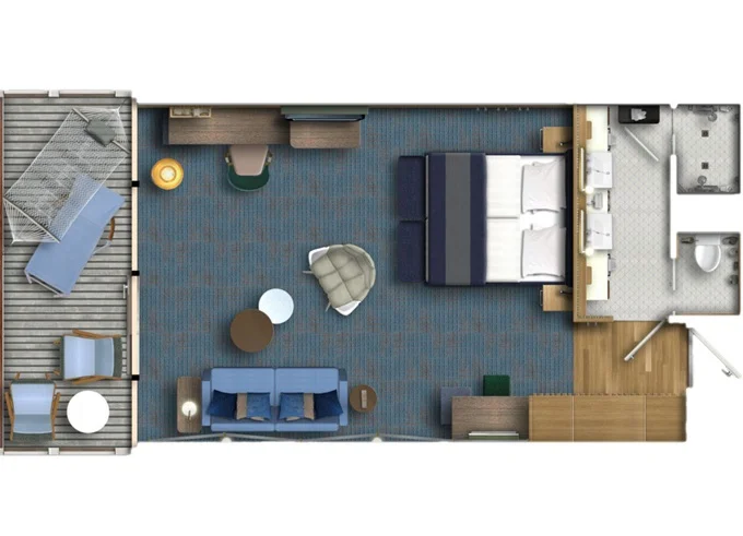 | SKAO - Schöne Aussicht Suite 39 m² + balkón 13-14 m² s ležadlami a hojdacou sieťou. 7-14. paluba. Max 4 osoby. Výhody Suite. | 13 916 € 3 479 € za osobu | ||