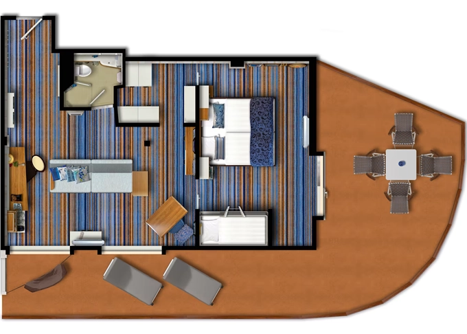 | SUTO - Themen Suite 54 m² + balkón 15 m² so stolom, ležadlom a hojdacou sieťou. Spálňa, obývacia časť, šatník. 10. paluba. Max 4 osoby. Výhody Suite. | 5 628 € 1 876 € za osobu | ||